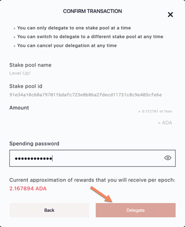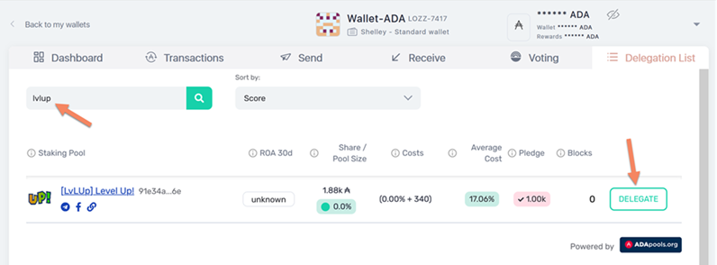 - Click on lvlup icon and click on Delegate to this pool