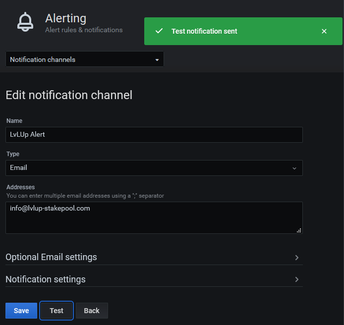 - Add a channel name, choose type Email and add email addresses you want to receive notifications. Before saving, test your new channel.
