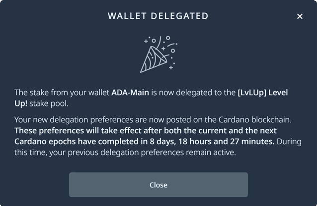 - Thank you! Your stake is now delegated to Level Up! Stake pool.